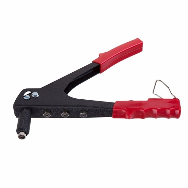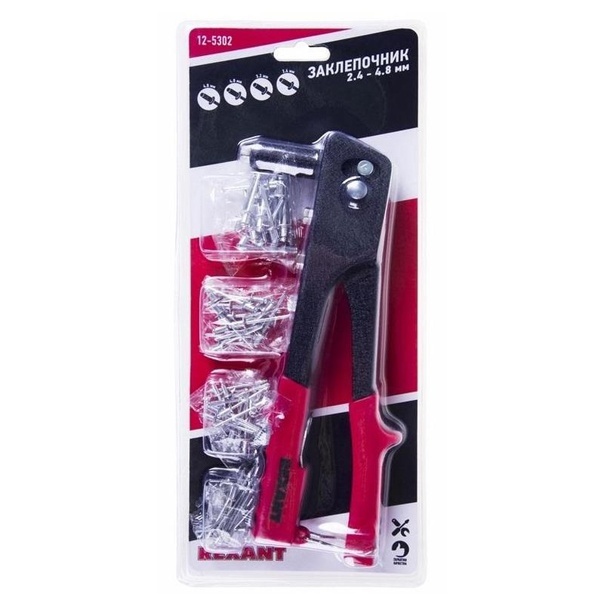 Заклепочник Rexant используется для скрепления деталей листовых материалов, тонкостенных конструкций и металлических профилей в труднодоступных местах. Для фиксации заготовок в комплекте представлено 60 заклепок диаметром 2,4 мм (15шт), 3,2 мм (15шт), 4,0 мм (15шт) и 4,8 мм (15шт). Рабочая часть инструмента изготовлена из конструкционной стали высокой прочности. Резиновые накладки на рукоятках предотвращают скольжение ладоней и обеспечивают удобство работы. Специальный механизм позволяет уменьшить усилие, прикладываемое на ручки. Скоба на конце рукояток упрощает хранение инструмента.