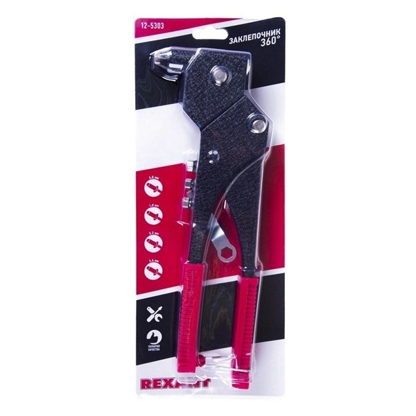 Заклепочник Rexant 12-5303 используется для скрепления деталей листовых материалов, тонкостенных конструкций и металлических профилей. Оснащен поворачивающейся головкой 360°, что позволяет работать в труднодоступных местах.Для фиксации заготовок используются металлические заклепки диаметром 2,4 мм, 3,2 мм, 4,0 мм и 4,8 мм. Рабочая часть инструмента изготовлена из конструкционной стали высокой прочности. Резиновые накладки на рукоятках предотвращают скольжение ладоней и обеспечивают удобство работы. Специальный механизм позволяет уменьшить усилие, прикладываемое на ручки. Скоба на конце рукояток упрощает хранение инструмента.