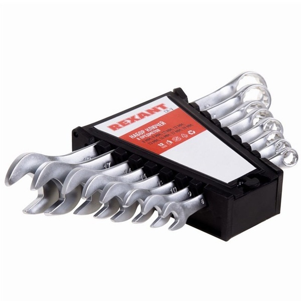 Набор гаечных комбинированных ключей предназначен для монтажа и демонтажа резьбовых соединений. С одной стороны ключа расположен захват открытого типа, с другой – накидного (кольцевого) типа. Кольцевой захват имеет 12 граней, благодаря чему улучшается сцепление с крепежом и уменьшается риск повреждения граней крепежа. Ключи изготовлены из высококачественной хромованадиевой стали (CrV). Хром-ванадиевый сплав (Chrome Vanadium) CrV, из которого изготовлен инструмент, обладает такими свойствами, как прочность, жесткость и устойчивость к износу. Во время прокаливания он менее подвержен деформациям и потере первоначальной формы, чем другие типы инструментальной стали.