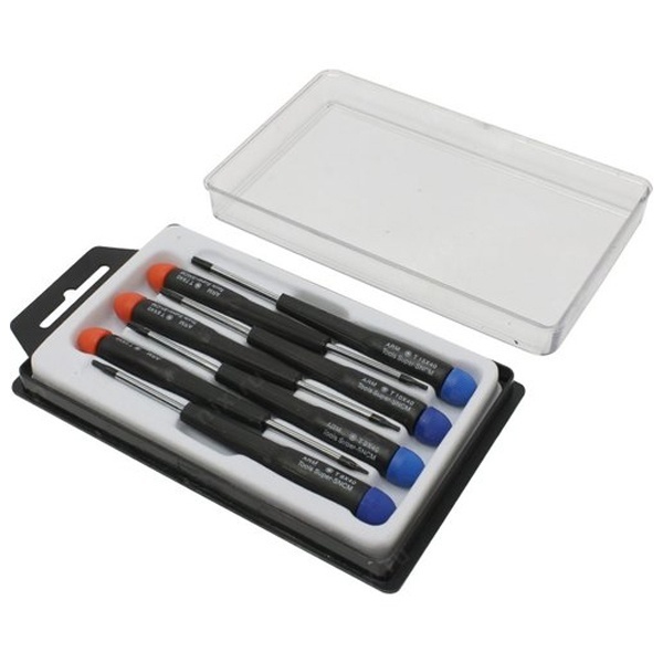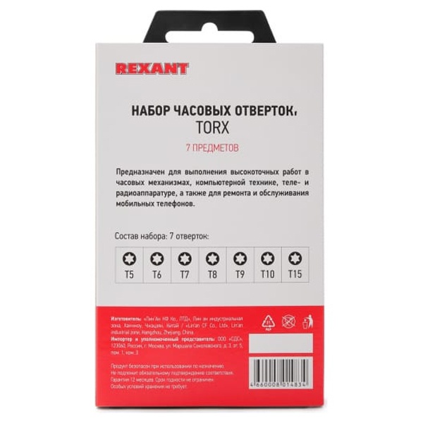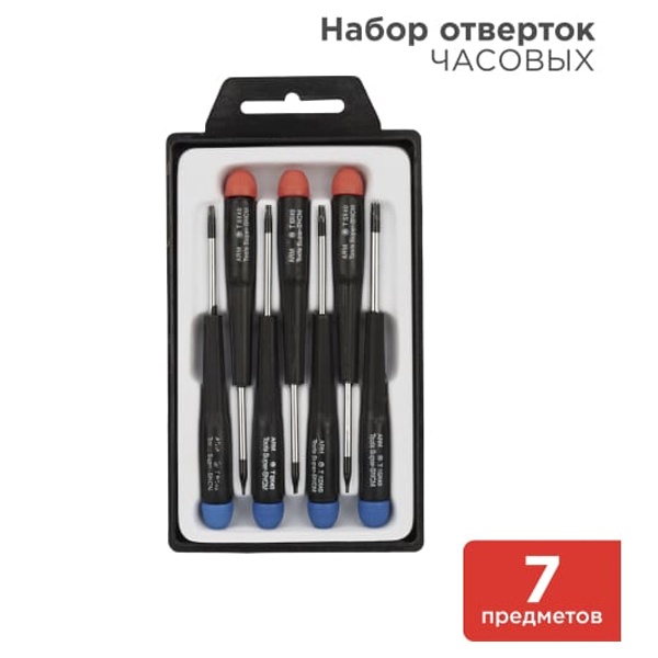Набор часовых отверток «TORX» ht-5214 REXANT предназначен для выполнения высокоточных работ в часовых механизмах, компьютерной технике, теле- и радиоаппаратуре, а также для ремонта и обслуживания мобильных телефонов. Отвертки изготовлены из высококачественной легированной стали с дополнительно термообработанными (для повышения износостойкости) наконечниками. Обрезиненная рукоятка со свободно вращающимся затыльником, обеспечивающим удобство при заворачивании микровинтов. В набор входят 7 отверток: Т5, Т6, Т7, Т8, Т9, Т10, Т15. Поставляется в пластиковой коробке с ложементом.