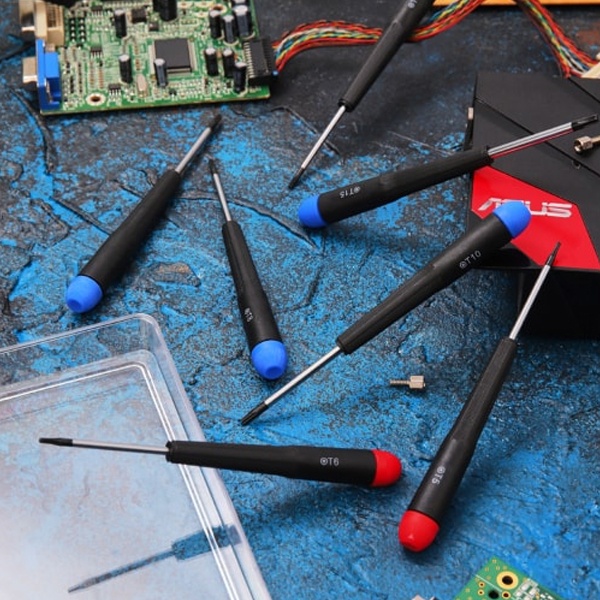 Практическая ценность таких отверток в том, что они дают контроль. Маленькая рукоятка и тонкий стержень позволяют подлезть к винтам в нишах и корпусах, где рядом идут дорожки, разъёмы, шлейфы и пластиковые защёлки. Когда работаешь с электроникой, лишнее усилие — частая причина сломанной стойки корпуса или сорванного “звёздочного” шлица. Здесь же идея простая: подобрать нужный размер TORX из набора и крутить ровно тем, что подходит, а не “похожим”.
