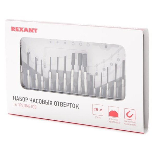 Набор часовых отверток (16 предметов) ht-16 REXANT предназначен для выполнения высокоточных механических работ: монтаж и ремонт электроаппаратуры — телевизоров, телефонов, очков, компьютеров, видеокамер; сборка и ремонт часов и т. п.