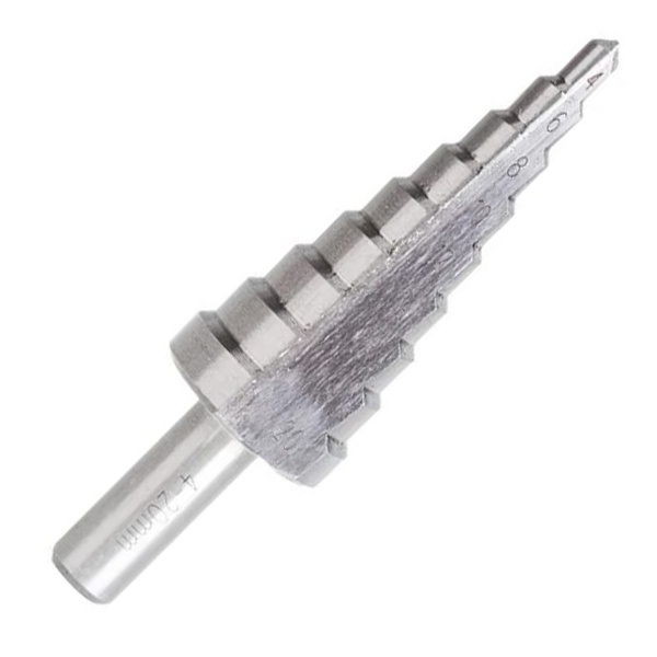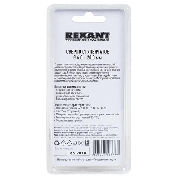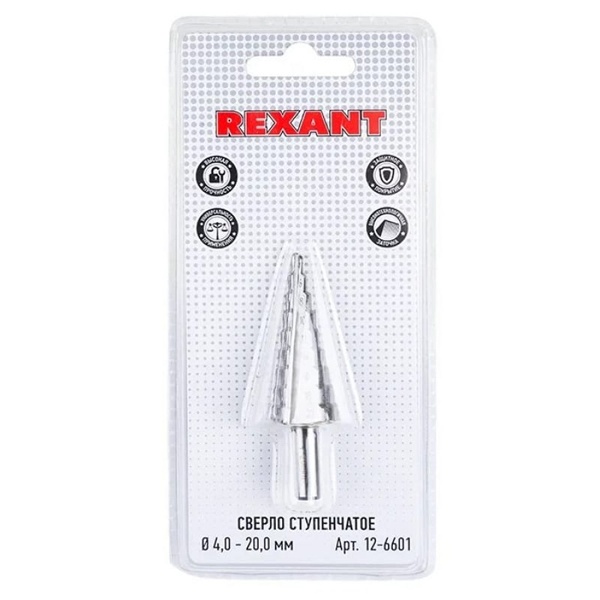 Универсальное ступенчатое сверло компании Rexant предназначено для сверления отверстий различных диаметров от 4 до 20 мм, без смены оснастки. Оно может использоваться в работе с такими материалами, как пластик, дерево, металл. Ступенчатое сверло изготовлено из высококачественной быстрорежущей стали, оно отличается особой прочностью и долгим рабочим ресурсом. Рабочая часть сверла имеет форму конуса, по всей поверхности которого есть ступени. На каждой ступени многоступенчатого сверла есть маркировка фактического диаметра, количество ступеней – 9, шаг ступеней – 2 мм. Диапазон ступеней – 4, 6, 8, 10, 12, 14, 16, 18, 20. Угол проточки – 118 градусов. Ступенчатое сверло имеет цилиндрический хвостовик. Форма канавки – прямая. Сверло обладает повышенной прочностью и точностью, имеет высокий рабочий ресурс. Вес инструмента – 76 грамм. В комплекте 1 сверло, оно упаковано в блистер.