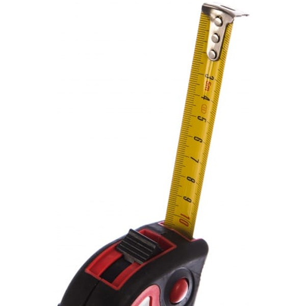 Рулетка оснащена механизмом стопора, который позволяет зафиксировать ленту на нужном расстоянии для удобства работы, а также системой автоматического возврата ленты в корпус, что существенно упрощает процесс работы с инструментом. Внешняя поверхность рулетки имеет прорезиненное покрытие, что делает её приятной на ощупь и предотвращает скольжение в руках, даже если они влажные или покрыты пылью. Также этот корпус защищает внутренние механизмы от грязи, пыли и влаги, увеличивая срок службы инструмента.