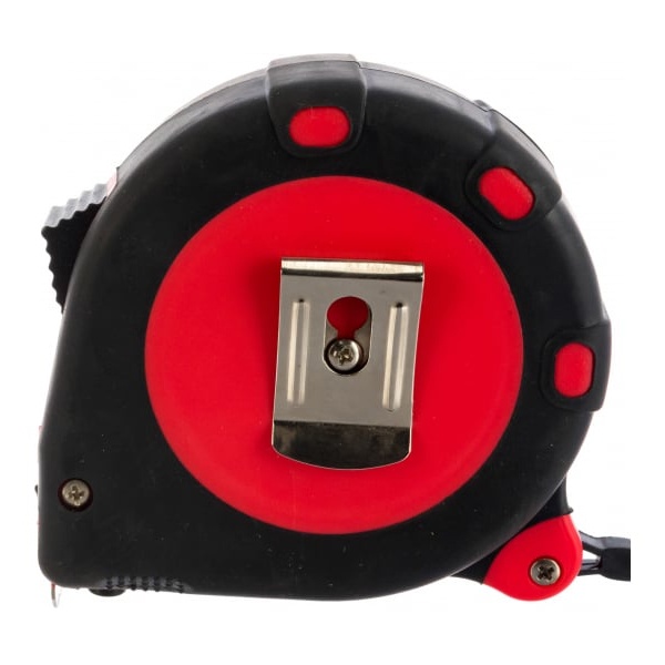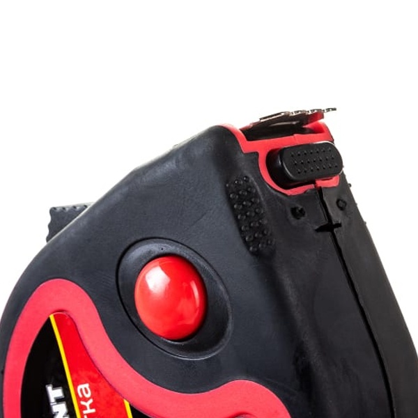 Рулетка оснащена механизмом стопора, который позволяет зафиксировать ленту на нужном расстоянии для удобства работы, а также системой автоматического возврата ленты в корпус, что существенно упрощает процесс работы с инструментом. Внешняя поверхность рулетки имеет прорезиненное покрытие, что делает её приятной на ощупь и предотвращает скольжение в руках, даже если они влажные или покрыты пылью. Также этот корпус защищает внутренние механизмы от грязи, пыли и влаги, увеличивая срок службы инструмента.