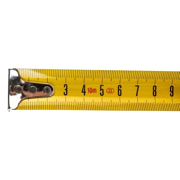 Длина измерения рулетки составляет 10 метров, а ширина ленты — 25 мм, что позволяет производить точные замеры на больших расстояниях. Широкая лента улучшает читаемость и устойчивость при измерениях, а также минимизирует вероятность излома при напряжении. Лента выполнена из высококачественного материала, что обеспечивает её долговечность и износостойкость. Она имеет четкую разметку с точными делениями, что позволяет быстро и точно определять нужные значения.
