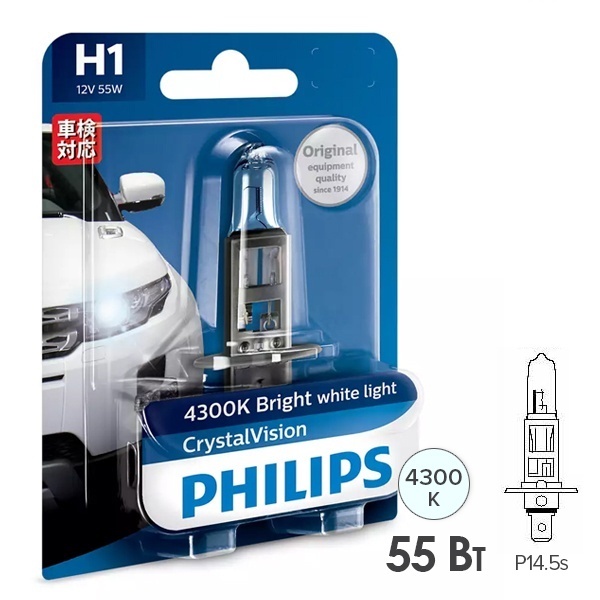 Автолампа головного освещения торговой марки Philips линейки Crystal Vision с ярким белым светом представляет собой галогенный осветительный прибор типа H1 с патроном P14,5s. Лампа имеет одну нить накала и ее номинальная мощность составляет 55 Ватт, которая работает от сети автомобиля 12 Вольт. Галогенная лампа имеет колбу с синим покрытием и излучает яркий белый свет с цветовой температурой 4300 Кельвинов. Модель этой серии обеспечивает хорошую видимость и делает автомобиль заметным и стильным. Она подходит для вождения как в городе, так и за его пределами. Это идеальное решение для эффективного освещения дорожного полотна с ярким белым светом. Также свет этой лампы максимально приближен к естественному дневному, что делает его приятным для глаз и не вызывает усталости, в отличие от стандартных источников освещения. Срок службы изделия составляет 400 часов. Эта модель отличается высокими эксплуатационными характеристиками и надежностью. Она обладает современным дизайном с серебристым колпачком, что делает эту лампу идеальным вариантом для полностью прозрачных фар. Лампа упакована в фирменный блистер. При транспортировании ее следует предохранять от механических повреждений.
