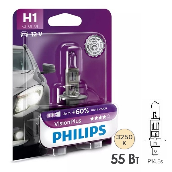Галогенная лампа нового поколения бренда Philips линейки Vision Plus благодаря инновационным лазерным технологиям обеспечивает до 60% больше яркости, если сравнивать с минимальными установленными требованиями, а тщательно продуманная структура нити накала позволяет добиться дополнительной светоотдачи. Она обладает оптимальным соотношением срока службы и освещенности и относится к типу Н1 с патроном Р14,5s. Изделие работает от сети автомобиля 12 Вольт. Номинальная мощность составляет 55 Ватт. Световой поток устройства равен 1780 Люменов, а цветовая температура достигает 3250 Кельвинов. Этот источник света используется в головном освещении: фарах ближнего и дальнего света и противотуманных фарах легковых автомобилей. Главными преимуществами галогенной лампы является то, что ее яркость на 60% больше по сравнению с требованиями стандартов. Она обеспечивает превосходный обзор, ее мощный световой поток увеличивает безопасность движения, так как водитель получает больший запас времени для маневра. Лампа имеет отличное соотношение продолжительности работы и эксплуатационных характеристик. Срок ее службы составляет 350 часов. В комплект входит 1 изделие, которое упаковано в фирменный блистер.