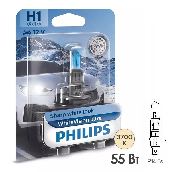 Высокотехнологичная галогенная автолампа нового поколения от компании Philips серии White Vision Ultra с новейшей формулой покрытия излучает потрясающий белый свет. Это самая белая галогенная лампа для дорог общего пользования, одобренная ECE и правильный выбор для яркого и стильного вождения. Благодаря новой усовершенствованной формуле покрытия стекла, лампа обеспечивает отличный обзор без ущерба для безопасности и не ослепляет встречные автомобили. Она обладает оптимальным соотношением срока службы и освещенности и относится к типу Н1 с патроном Р14,5s, которая работает от сети автомобиля 12 Вольт. Номинальная мощность лампы составляет 55 Ватт. Световой поток устройства равен 1550 Люменов, цветовая температура достигает до 3700 Кельвинов. Этот источник света используется в головном освещении: фарах ближнего и дальнего света и противотуманных фарах легковых автомобилей. Главными преимуществами галогенной лампы является то, что ее яркость на 60% больше по сравнению с требованиями стандартов, она обеспечивает превосходный обзор. Срок службы галогенного источника света составляет 250 часов. В комплект входит 1 изделие, которое упаковано в фирменный блистер.