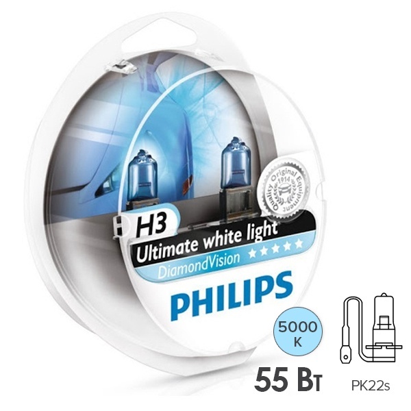 Высокотехнологичные галогенные лампы известной компании Philips серии Diamond Vision обладают стильным холодным белым светом с голубым оттенком, близким к свету ксеноновых ламп. Их специальная конструкция усиливает световой поток, обеспечивает безопасность использования и более высокую производительность. Они относятся к типу Н3, имеют патрон PK22s и предназначены для головного освещения легковых автомобилей с бортовым напряжением 12 Вольт. Номинальная мощность каждого устройства составляет 55 Ватт. Особое голубое покрытие изделий делает автомобиль более заметным, а улучшенная видимость значительно увеличивает время для совершения маневра по сравнению со стандартными галогенными лампами. Высокая контрастность обеспечивает улучшенный обзор ночью и в неблагоприятных погодных условиях. Осветительные приборы имеют цветовую температуру 5000 Кельвинов, а их световой поток равен 800 Люменов. Они упакованы в пластиковый бокс в количестве 2 штук. В целях безопасности и симметричного светораспределения следует производить замену ламп обеих фар одновременно. Лампа не соответствует нормам ЕСЕ.