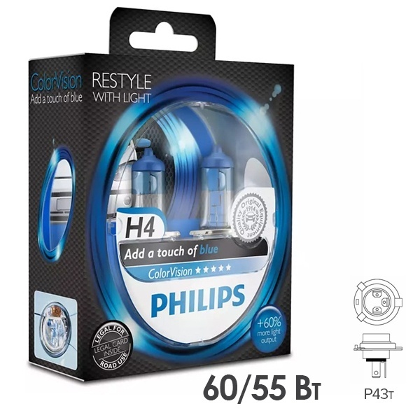Инновационные цветные галогенные автомобильные лампы компании Philips серии Color Vision обеспечивают прекрасное освещение, излучая белый безопасный свет с синим оттенком. Они обладают улучшенным на 60% световым потоком и позволяют водителям видеть дальше и четче на дороге. Эти лампы принадлежат типу Н4 с цоколем Р43t. В колбе изделия расположены две нити накаливания, одна из которых обеспечивает свойства ламп ближнего света, с мощностью 55 Ватт, а вторая – дальнего, с мощностью 60 Ватт. Эти устройства питаются от сети 12 Вольт. Их главным преимуществом является яркий белый свет с синим оттенком, который придает автомобилю более стильный вид, а температура его свечения достигает 3350 Кельвинов. Световой поток нитей накала составляет 1000 и 1600 Люменов для ближнего и дальнего света. Благодаря колбе из кварцевого стекла эти лампы способны выдержать резкие перепады температуры, они прочные и долговечные. Современные цветные автомобильные лампы сертифицированы для использования в автомобильных фарах. С их помощью создается стильное освещение с безопасным белым излучением. Срок службы комплекта равен примерно 400 часов. Устройства имеют сертификат ЕСЕ. Набор включает 2 лампы, упакованные в пластиковый бокс.
