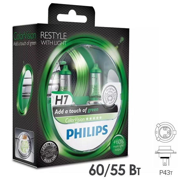 Инновационные цветные галогенные автомобильные лампы компании Philips серии Color Vision обеспечивают прекрасное освещение, излучая белый безопасный свет с зеленым оттенком. Они обладают улучшенным на 60% световым потоком и позволяют водителям видеть дальше и четче на дороге. Эти лампы принадлежат типу Н4 с цоколем Р43t. В колбе изделия расположены две нити накаливания, одна из которых обеспечивает свойства ламп ближнего света, с мощностью 55 Ватт, а вторая – дальнего, с мощностью 60 Ватт. Эти устройства питаются от сети 12 Вольт. Их главным преимуществом является яркий белый свет с зеленым оттенком, который придает автомобилю более стильный вид, а температура его свечения достигает 3350 Кельвинов. Световой поток нитей накала составляет 1000 и 1600 Люменов для ближнего и дальнего света. Благодаря колбе из кварцевого стекла эти лампы способны выдержать резкие перепады температуры, они прочные и долговечные. Современные цветные автомобильные лампы сертифицированы для использования в автомобильных фарах. С их помощью создается стильное освещение с безопасным белым излучением. Срок службы комплекта равен примерно 400 часов. Устройства имеют сертификат ЕСЕ. Набор включает 2 лампы, упакованные в пластиковый бокс.