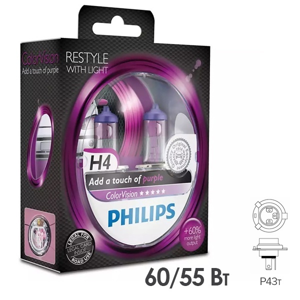 Галогенные автомобильные лампы нового поколения торговой марки Philips серии Color Vision с белым светом и розовым акцентом обеспечивают высокий уровень освещенности дороги и создают необычный цветной эффект. Устройства принадлежат к типу Н4 с цоколем Р43t. Они имеют 2 нити накала. Их мощность составляет 55 и 60 Ватт. Лампы работают от сети автомобиля 12 Вольт. Они соответствуют европейским стандартам и обеспечивают прекрасную видимость. Изделия применяются для головного освещения легковых автомобилей. Световой поток нитей накала, обеспечивающих ближний и дальний свет фар равен 1000 и 1600 Люменов соответственно, а цветовая температура ламп достигает 3200 Кельвинов. Достоинствами этих галогенных источников света являются повышенная на 60% светоотдача и на 25 м больше освещенная зона перед автомобилем. Яркий бело-розовый световой луч делает автомобиль стильным, а вождение более комфортным и безопасным. Благодаря использованию качественных материалов и передовых технологий они отличаются надежностью и долговечностью. Срок службы каждой модели достигает до 400 часов. В комплект входят 2 изделия, которые упакованы в пластиковый бокс.