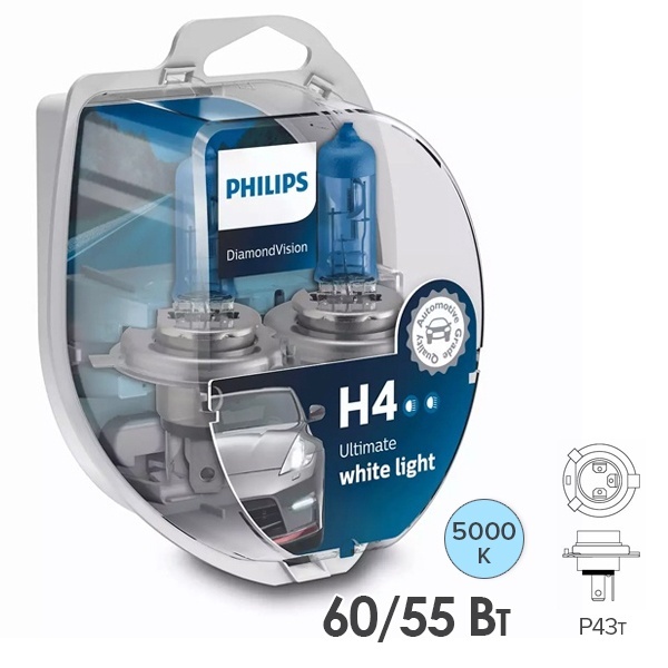 Современные галогенные лампы торговой марки Philips серии Diamond Vision обладают стильным холодным белым светом с голубым оттенком, близким к свету ксеноновых ламп. Осветительные приборы имеют цветовую температуру 5000 Кельвинов, их световой поток составляет 935 Люменов. Высокая контрастность ламп обеспечивает улучшенный обзор ночью и в неблагоприятных погодных условиях. Устройства относятся к типу Н4 с цоколем Р43t согласно стандарта IEC – это одновременно лампа ближнего и дальнего света, в которой меняется интенсивность луча, что даёт возможность освещать дорогу прямо перед автомобилем или далеко впереди. Мощность нити накаливания в режиме ближнего света составляет 55 Ватт, а в режиме дальнего света – 60 Ватт. Они работают от сети автомобиля 12 Вольт. Лампы предназначены для ближних и дальних фар легковых автомобилей. Особое голубое покрытие моделей делает автомобиль более заметным, а улучшенная видимость значительно увеличивает время для совершения маневра по сравнению со стандартными галогенными лампами. Они обладают высокой прочностью и отличаются высокой устойчивостью к перепадам температур и вибрации. Срок службы устройств равен до 400 часов. Упакованы галогенные лампы в пластиковый бокс в количестве 2 штук. Соответствия нормам ЕСЕ - нет.