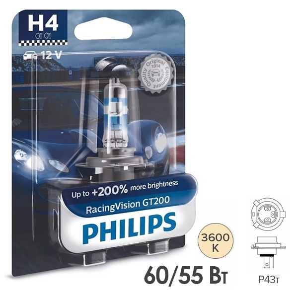 Современная автомобильная галогенная лампа ведущего производителя Philips серии Racing Vision GT200 имеет повышенную на 200% яркость и увеличивает дальность светового луча до 80 м. Это обеспечивает более четкую видимость, позволяет водителю быстрее реагировать в разных ситуациях и получать дополнительное удовольствие от управления автомобилем. Эта модель имеет две нити накаливания и выполнена по типу Н4 с цоколем P43t. В режиме ближнего света лампа имеет мощность 55 Ватт, а в режиме дальнего света – 60 Ватт. Яркий световой поток увеличивает безопасность движения, так как водитель получает больший запас времени для маневра. Цветовая температура лампы составляет 3600 Кельвинов, световой поток равен 1000 и 1650 Люменов для каждой нити накала. Срок службы устройства достигает 500 часов. Модель соответствует стандарту ECE для дорог общего пользования. Она пригодится тем, кто любит путешествовать в условиях плохой видимости или в темное время суток, а также тем, кому не хватает стандартного штатного света по разным причинам. Для симметричного освещения настоятельно рекомендуется менять эти лампы парами. В комплект входит 1 лампа, упакованная в фирменный блистер.