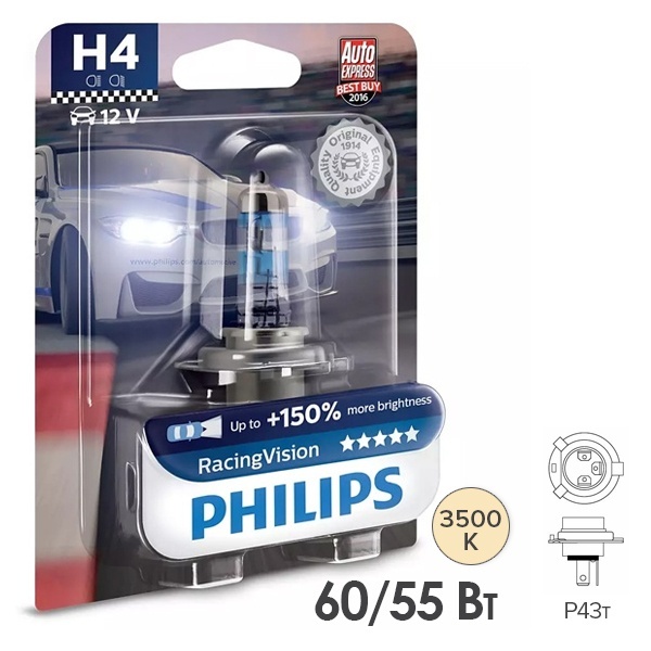 Автомобильная лампа торговой марки Philips линейки Racing Vision с увеличенной на 150% освещенностью представляет собой двухнитевый осветительный галогенный прибор типа Н4 с цоколем Р43t. Она применяется для ближнего и дальнего света фар легковых автомобилей с бортовым напряжением 12 Вольт. Мощность нити накаливания в режиме ближнего света составляет 55 Ватт, в режиме дальнего света – 60 Ватт. Увеличенная яркость и улучшенные характеристики лампы необходимы водителям, увлекающимся автомобильным спортом. Эта галогенная модель излучает более яркий свет с мощностью светового потока 1650 Люменов и цветовой температурой 3500 Кельвинов и обеспечивает великолепные впечатления от света фар как на шоссе, так и во внедорожных условиях. Благодаря улучшенной видимости водители быстрее реагируют на опасности при вождении. При изготовлении лампы использованы высококачественные материалы, поэтому она обладает хорошей прочностью и отличается высокой устойчивостью к перепадам температур и вибрации. Срок службы прибора составляет 200 часов. Изделие упаковано в фирменный блистер. При транспортировании его следует предохранять от механических повреждений.