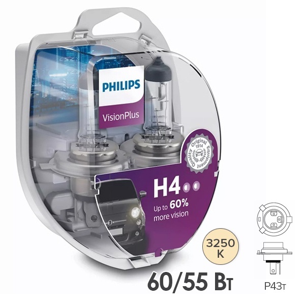 Современные галогенные лампы известной торговой марки Philips линейки Vision Plus имеют увеличенную на 60% яркость и гарантируют повышенную безопасность на дороге. Это идеальное решение для ближнего и дальнего света фар, а также для передних противотуманных фонарей легковых автомобилей с бортовым напряжением 12 Вольт. Они относятся к типоразмеру Н4 с цоколем Р43t. Номинальная мощность ламп равна 55 и 60 Ватт для каждой нити накаливания, которые обеспечивают свойства ближнего и дальнего света. Они излучают световой поток мощностью до 1650 Люменов, их цветовая температура достигает 3250 Кельвинов. Специальная технология защиты от ультрафиолетового излучения Philips защищает фары от вредного ультрафиолетового излучения, благодаря чему кварцевое стекло с УФ-покрытием идеально подходит для любых условий вождения и обеспечивает долговечность ламп. Срок службы приборов составляет 400 часов. Для равномерного светораспределения на дороге их следует заменять парами. Эти осветительные устройства поставляются в комплекте в количестве 2 штук в пластиковом боксе.