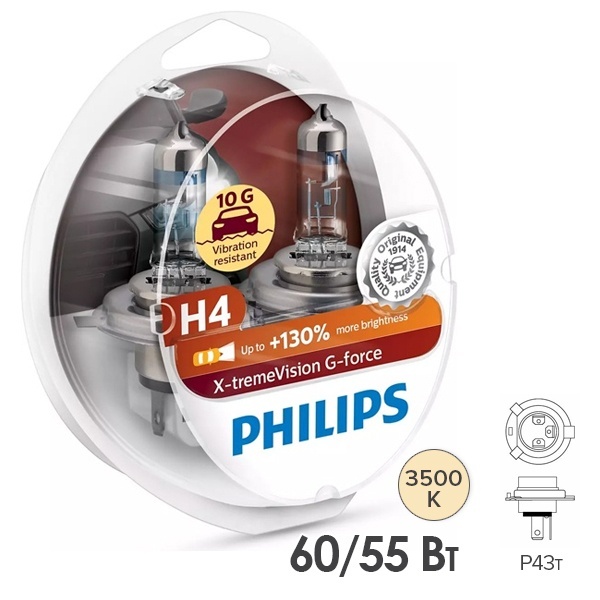 Набор ярких автомобильных ламп бренда Philips линейки X-treme Vision G-force представляет собой галогенные источники света для головного освещения легковых автомобилей с бортовым напряжением 12 Вольт. Они излучают на 130% больше света, более длинный световой пучок и обладают устойчивостью к вибрациям. Галогенные лампы обеспечивают улучшенный обзор и комфортное вождение в темное время суток. Устройства относятся к типу Н4 с цоколем Р43t и имеют две нити накаливания, одна из которых обеспечивает ближнего света, ее мощность составляет 55 Ватт, вторая - дальнего света, ее мощность имеет 60 Ватт. Их световой поток равен 1000 и 1650 Люменов соответственно. Лампы излучают яркий свет с цветовой температурой, достигающей 3500 Кельвинов, который значительно белее света стандартных ламп головного освещения. Срок службы устройств составляет 450 часов. Все это способствует более уверенному и безопасному вождению. Лампы имеют одобрение ECE. В комплект входят 2 лампы, которые упакованы в прозрачный пластиковый бокс.