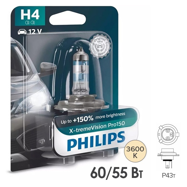 Надежная современная автолампа компании Philips серии X-treme Vision Pro150 с добавленной на 150% яркостью и увеличенным сроком службы дает луч света на 20 м длиннее обычных ламп, гарантируя лучшую видимость даже в темноте и неблагоприятных погодных условиях. Для водителей, использующих такие лампы, вождение по трассе становится менее утомительным, а дорожные знаки и препятствия более заметными. По стандарту ECE устройство принадлежит к типоразмеру Н4 с патроном Р43t и представляет собой галогенный осветительный прибор, в котором в одной колбе расположены две нити. Одна из них обеспечивает свойства ламп ближнего света, ее мощность составляет 55 Ватт, а вторая – для дальнего света, ее мощность равна 60 Ватт. Усовершенствованная конструкция нити накала и новая технология кварцевого стекла обеспечивают большую точность и яркость светового потока лампы, а также ее долговечность и надежность. Срок службы устройства составляет 540 часов. Эта галогенная модель излучает более белый свет с цветовой температурой 3600 Кельвинов и обеспечивает больший контраст на дороге для безопасного и уверенного вождения. Мощность ее светового потока достигает до 1000 и 1650 Люменов для разных режимов освещения. Лампа подходит для света ближних и дальних фар легковых автомобилей с бортовым напряжением 12 Вольт. В комплект входит 1 изделие, которое упаковано в фирменный блистер.
