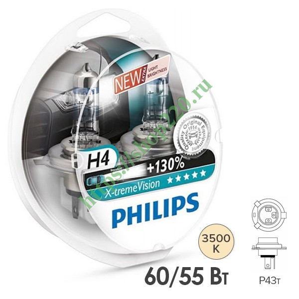Яркие галогенные лампы известного производителя Philips серии X-treme Vision c увеличенной на 130% освещенностью – это идеальное решение для ближнего и дальнего света фар легковых автомобилей. Они позволяют увеличить видимость на 45 м, что дает водителям дополнительно 2 секунды для реакции. Лампы относятся к типу Н4 с цоколем Р43t. Мощность нити накаливания в режиме ближнего света составляет 55 Ватт, в режиме дальнего света – 60 Ватт. Лампы работают от сети 12 Вольт. Цветовая температура устройств достигает 3500 Кельвинов. Данный набор галогенных источников излучает более яркий свет с мощностью светового потока 1000 и 1650 Люменов для разных режимов освещения. Достоинствами этих осветительных приборов является их повышенная яркость, благодаря этому водители могут раньше распознать препятствия или потенциальную опасность. Лампы имеют хороший ресурс со сроком службы примерно 450 часов. Эти изделия поставляются в комплектом в количестве 2 штук и упакованы в пластиковый бокс. Для равномерного светораспределения на дороге лампы следует заменять парами.