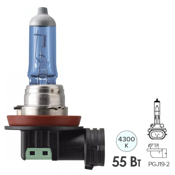 Галогенный источник света с голубым покрытием колбы и серебристым колпачком излучает яркий белый свет с цветовой температурой 4300 Кельвинов. Он предназначен для головного освещения легковых автомобилей. Световой поток устройства равен 1350 Люменов. Лампа обеспечивает хорошую видимость и делает автомобиль заметным. Это идеальное решение для стильного и эффективного освещения дорожного полотна с ярким белым светом. Срок службы изделия составляет 400 часов. Эта модель отличается высокими эксплуатационными характеристиками и надежностью. Она не имеет разрешения ECЕ, и ее нельзя использовать на дорогах общего пользования. Лампа упакована в фирменный блистер. При транспортировании ее следует предохранять от механических повреждений.