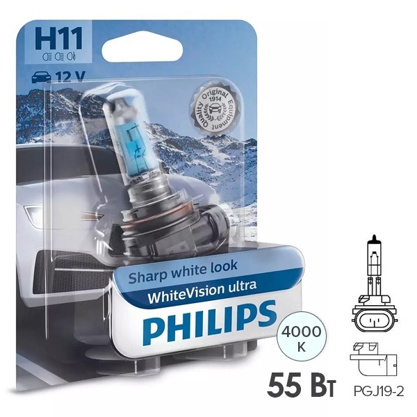 Автомобильная галогенная лампа от известного производителя автосвета Philips серии WhiteVision Ultra со специальным запатентованным покрытием и цветовой температурой до 4000 Кельвинов гарантирует превосходное освещение в любых условиях. Ее световой поток равен 1350 Люменов. Это самая яркая лампа с белым светом, разрешенная ЕСЕ для использования на дорогах общей сети в ассортименте компании Philips. Кроме того, она придает автомобилю стильный внешний вид. Источник света относится к типу Н11 с цоколем РGJ19-2. Он имеет одну нить накала и обладает номинальным значением мощности 55 Ватт. Изделие рассчитано на работу от сети автомобиля 12 Вольт. Автомобильная лампа с холодным белым светом улучшает видимость в темное время суток до 60% и обладает более ярким световым пучком, что позволят не только лучше видеть других участников дорожного движения, но и сделает автомобиль более заметным для остальных. Таким образом, благодаря увеличенной яркости этот источник освещения обеспечивает безопасность движения, позволяет предотвращать потенциально аварийные ситуации и не ослепляет других водителей. Достоинством лампы является яркий белый свет, надежность и влагостойкость. Срок службы модели составляет примерно 300 часов. Она упакована в фирменный блистер.