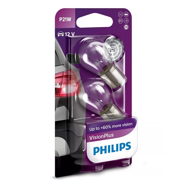 Автомобильные лампы накаливания от известной компании Philips из серии VisionPlus представляют собой источник освещения повышенной яркости, которые применяется для установки в задних противотуманных фонарях, фарах заднего хода и стоп-сигналах, ДХО, передних, боковых и задних указателях поворота, а также для подсветки номерного знака, внутрисалонного и багажного освещения. Они поставляются в блистере в количестве 2 штук и рассчитаны на бортовое напряжение 12 Вольт, что предполагает их размещение в легковых автомобилях. Такой тип источников света относится к категории P21W с цоколем BA15s. Мощность каждого изделия составляет 21 Ватт. Излучаемый свет обеспечивает на 50% более ярким свечением по сравнению с обычными лампами накаливания. С ними гарантирован комфорт и уверенность на дороге. Это отличный выбор для водителей, которые серьезно относятся к безопасности и улучшенной видимости. Сочетание высокой производительности и доступной цены приятно удивит даже самых требовательных покупателей. Лампы накаливания проходят тщательное тестирование, контроль и сертификацию, поэтому они по достоинству являются самыми надежными и проверенными в своем классе.