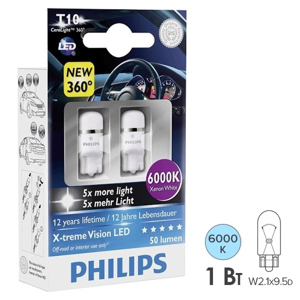 Салонные источники освещения автомобиля от известной компании Philips относятся к линейке ярких стильных светодиодных ламп X-tremeVision, которые используются в качестве внутренней подсветки различных зон багажного отделения, бортовой панели или бардачка. Данный набор включает в себя 2 керамические лампы с типоразмером W5W и патроном W2.1x9.5d. Они рассчитаны для установки в легковые автомобили с напряжением 12 Вольт. Запатентованная технология Ceralight обеспечивает защиту важных компонентов светодиодов и предотвращает их перегрев и повреждение из-за вибраций. Поэтому изделия отличаются продолжительным сроком службы и надежностью. Рабочий ресурс набора ламп составляет 12 лет. С их помощью создается не только превосходная видимость в салоне, но и стильный вид автомобиля. Яркий холодный свет с цветовой температурой 6000 Кельвинов приближен к дневному, не портит зрение, приятен и нейтрален для глаз человека. Благодаря максимальному обзору и равномерно распределенному свету можно с легкостью найти потерявшуюся вещь, построить маршрут на карте или с комфортом почитать в дороге. Мощность моделей составляет 1 Ватт, что подтверждает их экономичное энергопотребление. Они характеризуются отсутствием мерцания и термостойкостью. Высокое качество изготовления обеспечивает гарантированный интенсивный яркий свет, а совместимость со многими моделями автомобилей, простая и легкая установка делает изделия удобными в эксплуатации.