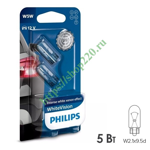 Высококачественные лампы накаливания от известного производителя Philips серии White Vision с эффектом яркого белого ксенонового света обладают не только стильным внешним видом, но и обеспечивают безопасность благодаря яркому излучению и великолепной видимости в ночное время суток. Они поставляются в блистерной упаковке в количестве 2 штук и предназначены для установки в габаритные фонари, стояночные огни, фары заднего хода, а также в салон автомобиля и багажный отсек. Такие лампы рассчитаны на бортовое напряжение 12 Вольт, поэтому используются в легковом автотранспорте, мопедах и мотоциклах. Лампы имеют специальное голубое покрытие колбы, которая придает свечению холодный оттенок, нейтральный для глаз человека и приятный для восприятия другими участниками движения. Цветовая температура достигает 4500 Кельвинов. Они относятся к категории W5W с цоколем W2.1x9.5d и обладают мощностью 5 Ватт. Продуманный дизайн и функциональность повышают комфорт и придают уверенность в дороге, так как увеличенная светоотдача на 60% предотвращает потенциально аварийные ситуации. Лампы соответствуют нормам ECE и является первым ярким белым светом, разрешенным для дорог общего пользования. Для максимальной эффективности замену автоламп всегда следует производить парами.