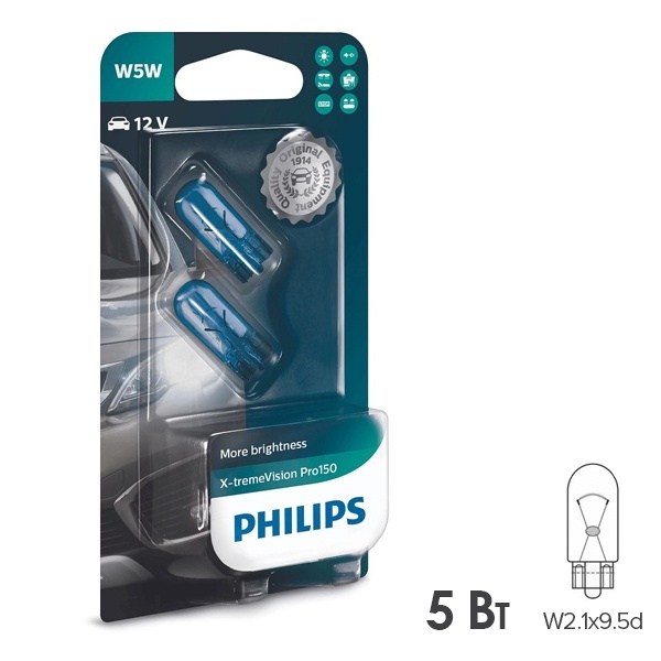 Улучшенные автомобильные лампы накаливания от известной компании Philips из линейки X-treme Vision Pro 150 сочетают в себе превосходную яркость и долговечность и обеспечивают дополнительную безопасность и уверенность в дороге. Они поставляются в блистерной упаковке по 2 штуки и предназначены для габаритных фонарей и стояночных огней, а также для внутреннего освещения. Эти источники света рассчитаны на бортовое напряжение 12 Вольт, поэтому используются в легковом автотранспорте и мотоциклах. Они относятся к категории W5W с цоколем W2.1x9.5d и обладают мощностью 5 Ватт. Яркость ламп увеличена на 150%, благодаря чему обеспечивается превосходный обзор даже в темное время суток и при сложных погодных условиях. Они излучают холодный белый свет, нейтральный для глаз человека и приятный для других участников движения. Его цветовая температура достигает 3300 Кельвинов, а световой поток – 50 Люменов. Срок службы изделий составляет 1500 часов, что позволяет реже производить замену. Для максимальной эффективности их всегда следует менять парами. Современные лампы обладают более высокой световой отдачей и производительностью.