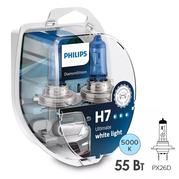 Современные галогенные лампы торговой марки Philips серии Diamond Vision обладают стильным холодным белым светом с голубым оттенком, близким к свету ксеноновых ламп. Осветительные приборы имеют цветовую температуру 5000 Кельвинов, их световой поток равен 935 Люменов. Их высокая контрастность обеспечивает улучшенный обзор ночью и в неблагоприятных погодных условиях. Устройства относятся к типу Н7 с цоколем Px26d. Их мощность составляет 55 Ватт. Они работают от сети автомобиля 12 Вольт. Лампы предназначены для ближних и дальних фар легковых автомобилей. Особое голубое покрытие колбы делает автомобиль более заметным, а улучшенная видимость значительно увеличивает время для совершения маневра по сравнению со стандартными галогенными лампами. Они обладают хорошей прочностью и отличаются высокой устойчивостью к резким перепадам температур. Срок службы устройств равен 400 часов. Изделия не имеют одобрения ECE. Они упакованы в пластиковый бокс в количестве 2 штук.