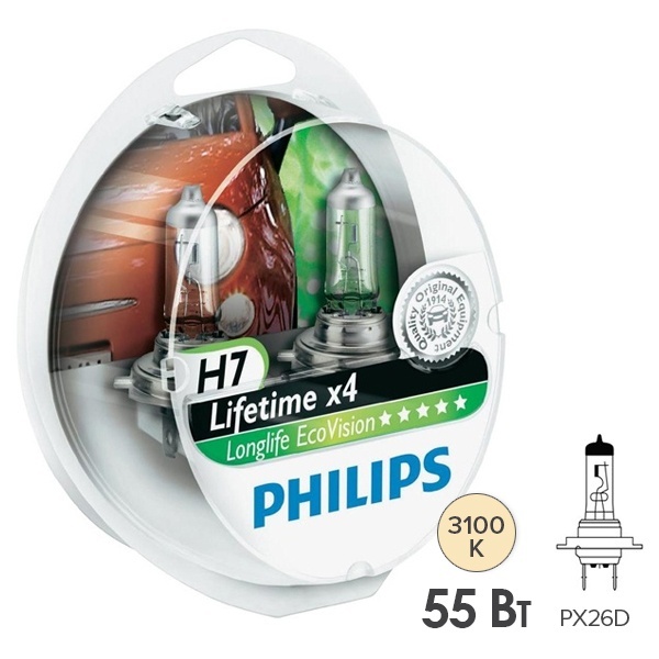 Автомобильные лампы нового поколения компании Philips серии Long Life EcoVision с увеличенным сроком службы выпускаются для ответственных водителей и представляют собой галогенные источники освещения категории Н7 с цоколем Px26d. Номинальная мощность устройств составляет 55 Ватт. Они работают от сети автомобиля 12 Вольт. Лампы предназначены для ближнего и дальнего света, а также для передних противотуманных фар легковых автомобилей. Они излучают яркий желто-белый свет. Их световой поток составляет 1500 Люменов, а цветовая температура равна 3100 Кельвинов. Благодаря высокопрочной нити накаливания эти лампы имеют более длительный цикл службы, что обеспечивает водителям дополнительный комфорт. Срок службы этих устройств достигает 1500 часов. Это правильный выбор для водителей, которые хотят снизить затраты на техобслуживание и стремятся к экологичности, чтобы создавать меньше отходов. В комплект входят 2 изделия, которые упакованы в пластиковый бокс.