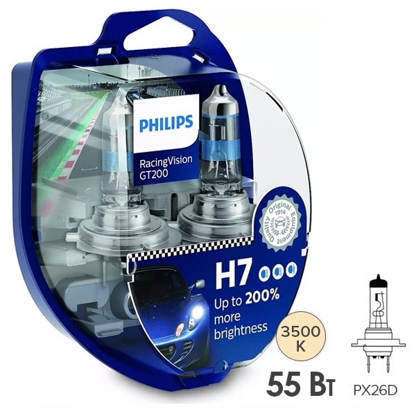 Яркие галогенные лампы нового поколения надежного производителя Philips серии Racing Vision GT200 с увеличенной на 200% освещенностью обеспечивают кристальную четкость светового луча и позволяют видеть дорогу дальше. Они станут отличным выбором для водителей, которые ценят яркий свет. Устройства относятся к категории Н7 с цоколем Px26d. Номинальная мощность приборов составляет 55 Ватт. Лампы предназначены для ближнего и дальнего света фар и для передних противотуманных фонарей легковых автомобилей с бортовым напряжением 12 Вольт. Они излучают световой луч до 80 м длиннее, по сравнению с требованиями, предусмотренными стандартом. Это позволяет водителям реагировать на опасности на дороге быстрее. Световой поток ламп достигает 1500 Люменов. Их цветовая температура равна 3500 Кельвинов. Срок службы устройств равен 250 часов. Водителям, предпочитающим только лучшие решения, обязательно понравится яркий, мощный свет этих моделей, которые соответствуют всем актуальным требованиям законодательства. В комплект входят 2 лампы, которые упакованы в пластиковый бокс.