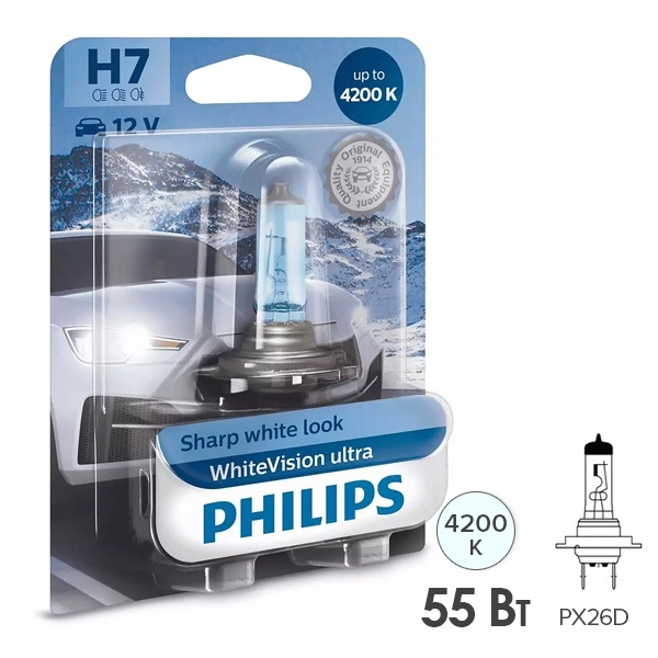 Современная автомобильная лампа компании Philips серии White Vision Ultra с абсолютно белым светом и улучшенной видимостью обеспечивает отличный обзор без ущерба для безопасности и не ослепляет встречные автомобили. Она представляет собой галогенный источник освещения и относится к категории Н7 с цоколем Px26d. Устройство применяется для ближнего и дальнего света фар легковых автомобилей и работает от напряжения сети 12 Вольт. Его номинальная мощность составляет 55 Ватт. Благодаря новой усовершенствованной формуле покрытия колбы, цветовая температура лампы достигает 4200 Кельвинов. Световой поток равен 1400 Люменов. Это самая белая галогенная лампа для дорог общего пользования, одобренная ECE и правильный выбор для любителей яркого и стильного вождения. Она излучает абсолютно белый свет, гарантирует превосходное освещение в любых условиях и обладает оптимальным соотношением эффективности и долговечности. Срок службы данной галогенной лампы составляет 350 часов. Ее главными достоинствами являются превосходный обзор дорожного полотна, яркость на 60% больше по сравнению с требованиями стандартов и абсолютно белый свет. В комплект входит 1 изделие, которое упаковано в фирменный блистер.
