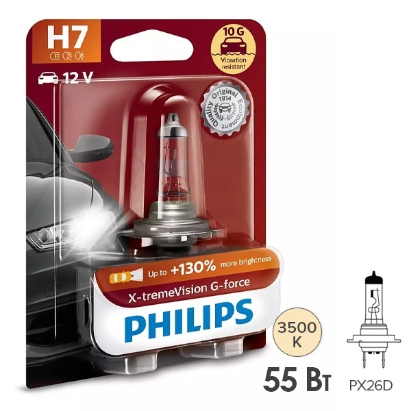 Надежная автомобильная лампа нового поколения компании Philips линейки X-treme Vision G-force обеспечивает до 130% больше света на дороге, улучшая тем самым обзор. Она обладает более длинным световым лучом и устойчивостью к вибрациям силой до 10 G. Лампа относится к категории Н7 с цоколем Px26d. Ее мощность равна 55 Ватт. Эта модель является одной из самых ярких среди представленных на рынке и применяется для ближнего и дальнего света фар легковых автомобилей с напряжением 12 Вольт. Ее цветовая температура достигает 3500 Кельвинов, а световой поток составляет 1500 Люменов. Она гарантирует непревзойденную видимость, которая обеспечивается без ущерба для ресурса лампы и является отличным решением для автомобилистов, которые ценят долговечность и надежность в любых, даже самых сложных дорожных условиях. Ее срок службы значительно превышает таковой у других ламп в данном классе и достигает 450 часов. Все это способствует более уверенному и безопасному вождению. Изделие имеет сертификат ECE. В комплект входит 1 лампа, упакованная в блистер.