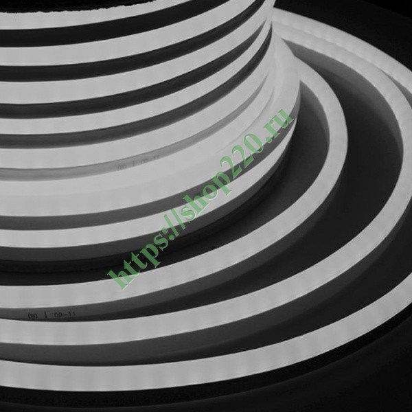 Гибкий неон - световой шнур выполненный из матовой белой ПВХ трубки с токопроводящими жилами и светодиодами внутри. Используется для декоративной и архитектурной подсветки объектов, так же широко распространён в украшении интерьера. Шнур имеет два токопроводящих провода внутри и используется в режиме постоянного свечения. Белый гибкий неон поставляется в бухтах длиной 50 м, имеет модуль резки 0,9 метра, следуя несложной инструкции легко можно отрезать и подключить гибкий неон нужной длины. Каждая бухта уже укомплектована 5-ю шнурами для подключения, максимальная подключаемая на 1 шнур длина 50 м. дополнительные шнуры можно приобрести отдельно. Температурный диапазон использования от -40 до +50 С, монтаж необходимо производить при температуре выше 0 градусов.
