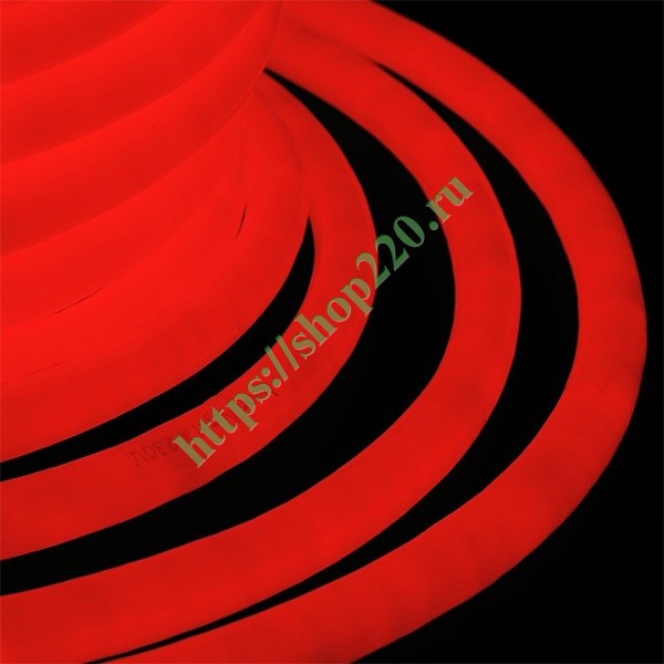 Гибкий неон - световой шнур выполненный из матовой красной ПВХ трубки с токопроводящими жилами и светодиодами внутри. Используется для декоративной и архитектурной подсветки объектов, так же широко распространён в украшении интерьера. Шнур имеет два токопроводящих провода внутри и используется в режиме постоянного свечения. Данный вид гибкого неона имеет угол свечения 360 градусов благодаря равномерному расположению светодиодов внутри ПВХ трубки. Гибкий неон поставляется в бухтах длиной 50 м. Следуя несложной инструкции легко можно отрезать и подключить гибкий неон нужной длины. Температурный диапазон использования от -45 до +35 °С, монтаж необходимо производить при температуре -25 до +35 °С. Допустимый диаметр изгиба составляет 3 см.