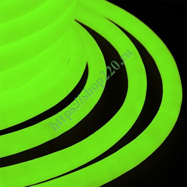 Гибкий неон - световой шнур выполненный из матовой зеленой ПВХ трубки с токопроводящими жилами и светодиодами внутри. Используется для декоративной и архитектурной подсветки объектов, так же широко распространён в украшении интерьера. Шнур имеет два токопроводящих провода внутри и используется в режиме постоянного свечения. Данный вид гибкого неона имеет угол свечения 360 градусов благодаря равномерному расположению светодиодов внутри ПВХ трубки. Гибкий неон поставляется в бухтах длиной 50 м. Следуя несложной инструкции легко можно отрезать и подключить гибкий неон нужной длины. Температурный диапазон использования от -45 до +35 °С, монтаж необходимо производить при температуре -25 до +35 °С. Допустимый диаметр изгиба составляет 3 см.
