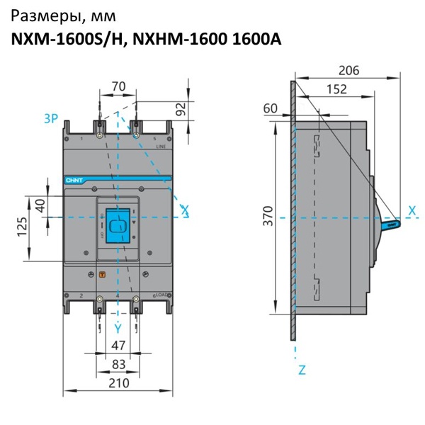 Трехполюсный силовой электрический автомат переменного тока 1600 Ампер, с отключающей способностью 50 кА, Чинт NXM-1600S, настраиваемый расцепитель 131378