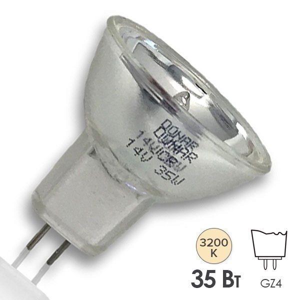 Специальная лампа от известного производителя светотехнической продукции Донар представляет собой галогенный источник света медицинского назначения, используемый в операционных светильниках, а также лабораторном оборудовании. Такой тип ламп относится к низковольтным изделиям, рассчитанным на напряжение сети 14 Вольт. Он обладает мощностью 35 Ватт и оснащен цоколем GZ4. Галогенная лампа отличается компактным размером со следующими значениями:
