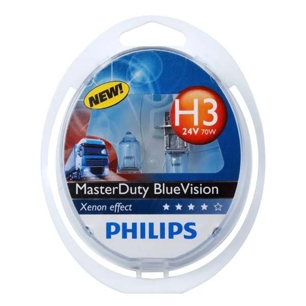 Высокотехнологичные галогенные лампы торговой марки Philips линейки MasterDuty BlueVision обеспечивают яркий белый свет с голубым оттенком со стильным ксеноновым эффектом и придают автомобилю привлекательный вид. Также свет этих ламп максимально приближен к естественному дневному свету, что делает его приятным для глаз и не вызывает усталости в отличие от стандартных источников света. Эти устройства относятся к типу Н3 с цоколем PK22s. Их номинальная мощность равна 70 Ватт, они работают от сети автомобиля 24 Вольта. Лампы используются в головном освещении: фарах ближнего и дальнего света, а также в передних противотуманных фарах грузовых автомобилей и автобусов. Они полностью соответствуют нормам ECE и являются самыми яркими источниками освещения среди разрешенных к использованию на дорогах общего пользования. Преимуществами данных осветительных приборов являются белый яркий свет, а также отличное соотношение эксплуатационных характеристик и срока службы. Высокая контрастность источников света обеспечивает улучшенный обзор ночью и в неблагоприятных погодных условиях. В комплект входят 2 изделия, которые упакованы в пластиковый бокс. При транспортировании их следует предохранять от механических повреждений.