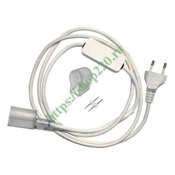 Установочный набор для подключения гибкого неона от производителя Neon-Night LED NEON FLEX состоит из силиконовой заглушки для изоляции обрезанного конца гибкого неона, белого сетевого шнура с вилкой из силикона для подключения в розетку 220-230 Вольт и двухконтактных разъемов для коммутации неона.
