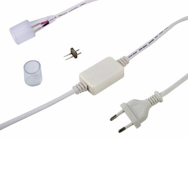 Этот комплект для монтажа гибкого неона 360, который подключается к электросети напряжением 220-230 Вольт, комплектуется электрошнуром длиной 1.5 м белого цвета, с вилкой и двухконтактным разъемом, заглушкой и 4-х Амперным выпрямителем тока. Установочный комплект довольно простой и годится для подсоединения гибкого неона своими силами.