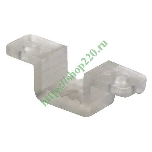 Прозрачный полимер, из которого выполнены клипсы, свободно пропускает неоновое свечение, что позволяет задействовать любое количество крепежа без ущерба всему световому сценарию. Подобный элемент имеет форму скобы с лапками, которые отведены в разные стороны под прямым углом. На лапках элемента имеются специальные отверстия для осуществления крепежа с помощью винтов. Крепеж не входит в комплект, так как его тип зависит от конкретной монтажной поверхности, но может быть включен в общий заказ по договоренности с продавцом.