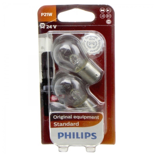 Автомобильные лампы накаливания от известной компании Philips из серии Standart представляют собой стандартные источники освещения, которые применяются в дневных ходовых огнях, задних противотуманных фонарях, фарах заднего хода, боковых, передних и задних указателях поворота, а также в качестве подсветки номерного знака, салона и багажного отделения. Они поставляются в блистерной упаковке в количестве 2 штук и рассчитаны на бортовое напряжение 24 Вольта, что предполагает их установку в грузовых автомобилях. Такой тип источников света относится к типоразмеру P21W с металлическим цоколем BA15s и излучает бело-желтый свет. Мощность каждого изделия составляет 21 Ватт. С ними гарантировано безопасное и уверенное вождение. Благодаря тому, что компания Philips утвердила свое лидерство в сфере автомобильного освещения, данным лампам отдают предпочтение как самым проверенным и надежным в своем классе. Они обладают высоким качеством изготовления и обеспечивают комфорт во время эксплуатации. Лампы накаливания проходят тщательное тестирование, контроль и сертификацию.
