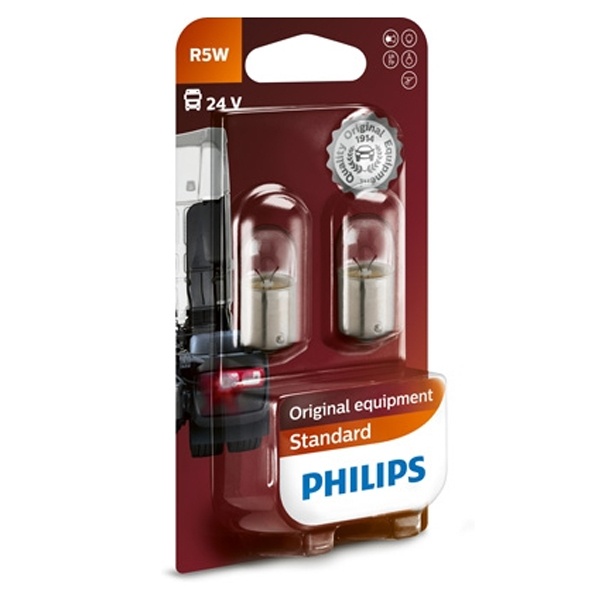 Автомобильные лампы накаливания от известной компании Philips из серии Standart представляют собой стандартные источники освещения, которые применяются в задних фарах и стоп-сигналах, габаритных и стояночных огнях, боковых указателях поворота, а также для подсветки номерного знака, внутрисалонного и багажного освещения. Они поставляются в блистерной упаковке по 2 штуки и рассчитаны на бортовое напряжение 24 Вольта, что предполагает их установку в грузовики и автобусы. Такой тип источников света относится к типоразмеру R5W с металлическим цоколем BA15s и излучает бело-желтый свет. Мощность каждого изделия составляет 5 Ватт, а световой поток, создаваемый изделиями, достигает 50 Люменов. Срок службы таких ламп соответствует 625 ч. С ними обеспечивается безопасное и уверенное вождение. Благодаря тому, что лампы накаливания Philips проходят тщательное тестирование, контроль и сертификацию, они по достоинству являются самыми надежными и проверенными в своем классе. Они обладают компактными размерами, легкой установкой и подключением, а также соответствует стандартам ECE. Это означает, что такие лампы разрешены для дорог общего пользования.