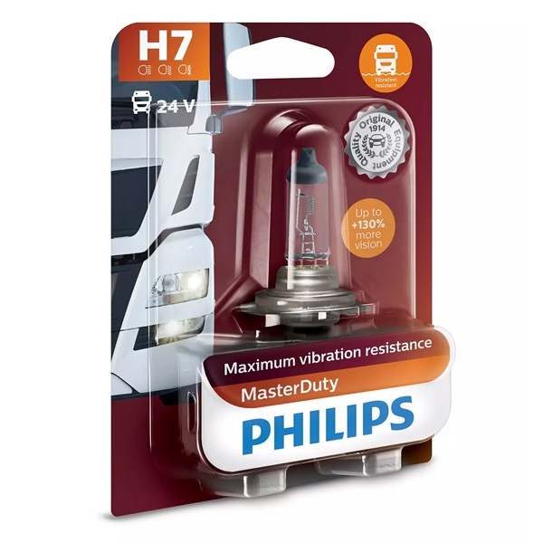 Надежная автомобильная лампа бренда Philips линейки MasterDuty имеет максимальную устойчивость к вибрациям и длительный срок службы. Она обеспечивает на 130% более яркий свет и представляет собой галогенный источник света для головного освещения грузовых автомобилей и автобусов с бортовым напряжением 24 Вольта. Эта модель относится к категории Н7 с цоколем Px26d. Лампа имеет одну нити накаливания. Ее мощность составляет 70 Ватт. Эта галогенная лампа излучает яркий желто-белый свет. Ее цветовая температура достигает 3200 Кельвинов. Она обеспечивает хороший обзор и комфортное вождение в темное время суток и в условиях непогоды. Передовые технологии производства и высококачественные материалы, применяемые в этой модели, обеспечивают большую устойчивость к тепловому удару и вибрации. Она оснащена более крепким основанием, что обеспечивает максимальную защиту от механических воздействий, в то время как надежная нить накаливания с двойной спиралью обеспечивает надежность и долговечность даже при воздействии сильных вибраций. Лампа имеет срок службы 550 часов и это правильный выбор для водителей, которым нужна максимальная долговечность. Изделие соответствует нормам ECE и упаковано в фирменный герметичный блистер.