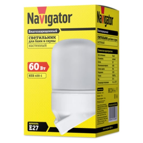 Влагозащищенный термостойкий светильник для бани и сауны Navigator серии NBL-SA с цоколем Е27 предназначен для наружного и внешнего освещения помещений с повышенным содержанием пыли и влаги.