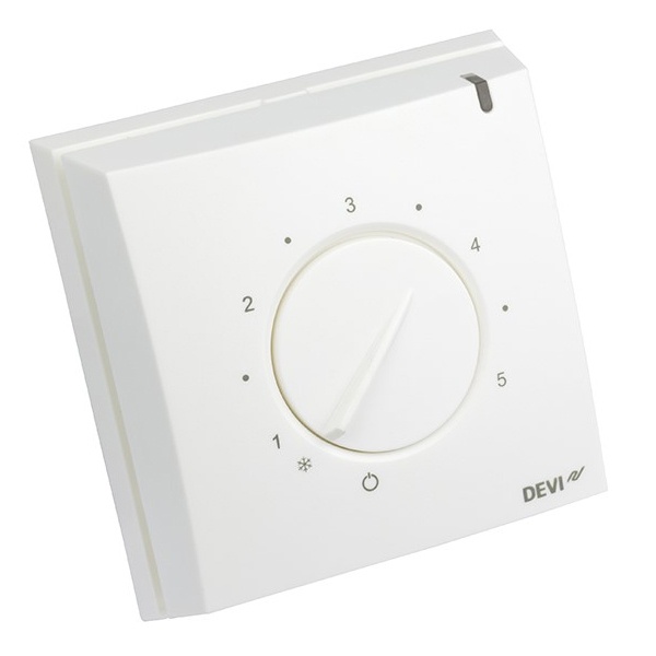 Конструкция корпуса терморегулятора Devireg 130 предполагает установку на поверхность стены, имеет одну ручку для регулирования и выключения.