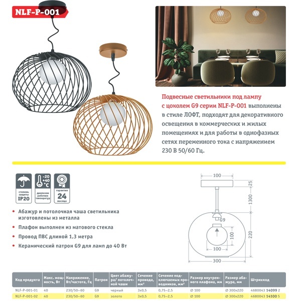 Подвесные светильники под лампу с цоколем G9 серии NLF-P-001 выполнены в стиле ЛОФТ, подходят для декоративного освещения в коммерческих и жилых помещениях и для работы в однофазных сетях переменного тока с напряжением 230 В 50/60 Гц.